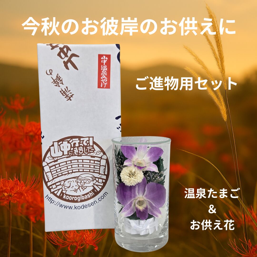 【秋彼岸限定】温泉たまごとグラスフラワーのご進物セット ~仏壇に飾れるお供え花と、ご家族で楽しめるやさしい味わい~